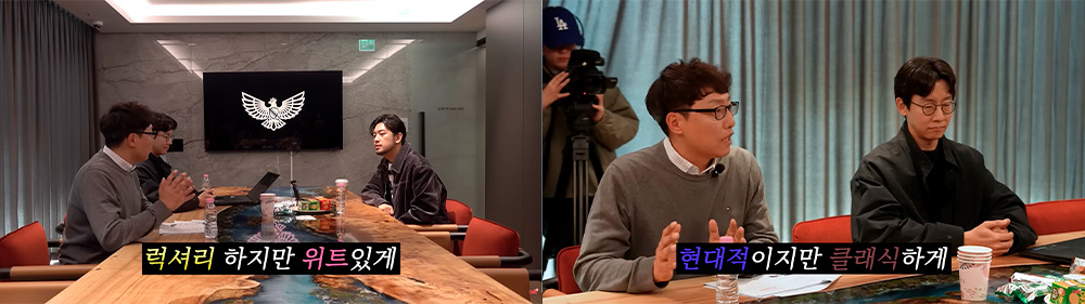 기획안을 준비할 때는 보통 경쟁사의 레퍼런스를 참고합니다. 그러나 앞서 말씀드렸듯이 건설업 콘텐츠는 유형이 제한적이라 레퍼런스로 활용하기에 아쉬움이 있습니다. 그래서 ‘건설업’이라는 틀에서 벗어나 ‘유튜브 생태계에서 통할 수 있는 콘텐츠’라는 관점으로 접근 방식을 전환했습니다. 브랜드의 방향성을 분명히 전달하면서도 재미를 더하려면 대중성과 영향력을 갖춘 화자가 필요했고, 그에 가장 적합한 인물로 침착맨을 떠올렸습니다.